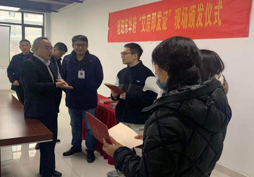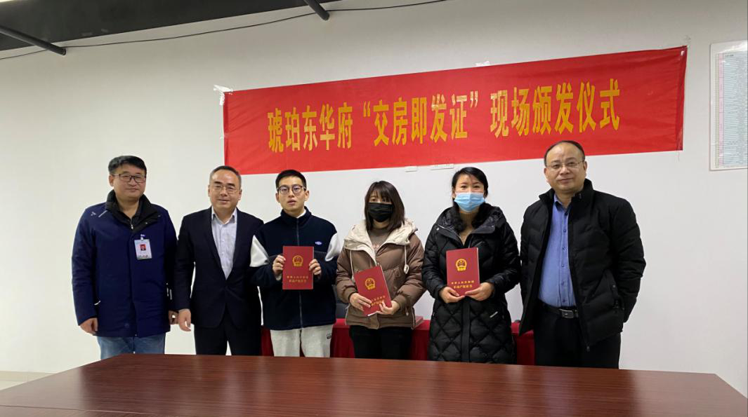 2021年1月21日上午10时,琥珀东华府项目举行了“交房即发证”现场不动产权证书颁发仪式,仪式由公司党委委员、副总经理王庆生主持,合肥市不动产登记中心副主任王国堂、合肥市不动产登记中心瑶海分中心主任韩斗泉等相关部门领导及部分琥珀东华府业主代表参加了此次发证仪式。